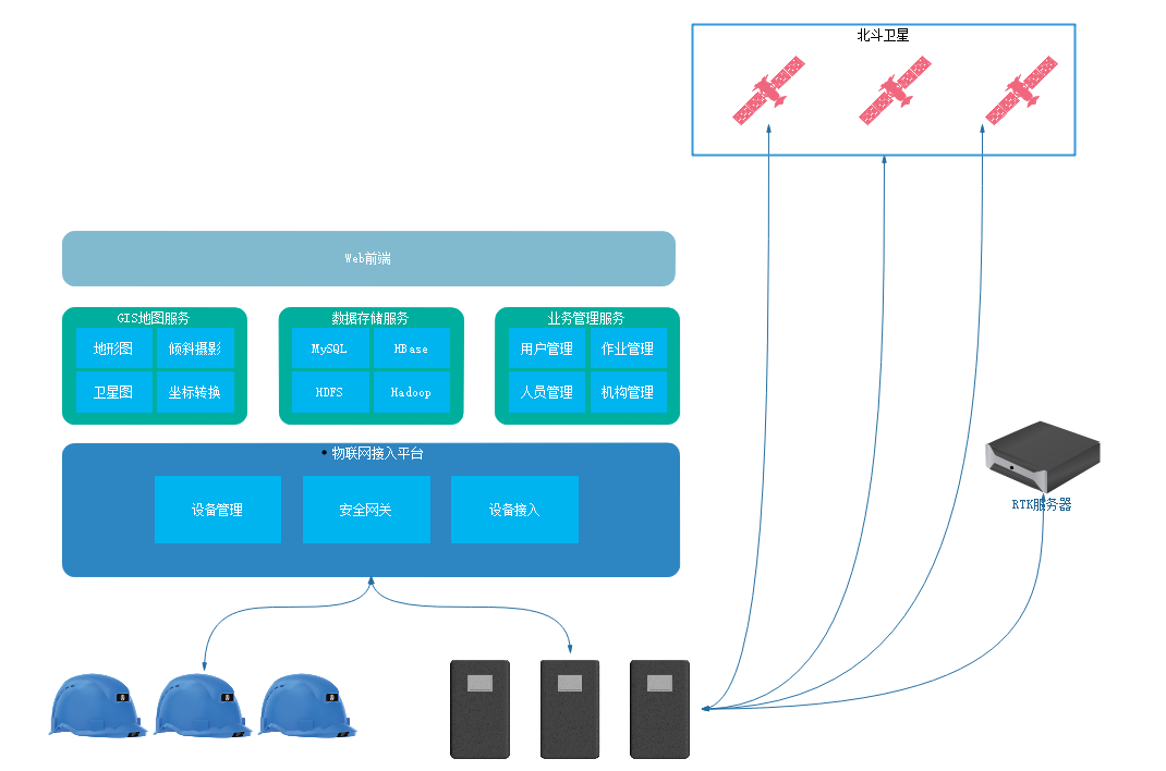 以北斗智能安全卡和多功能智能安全帽作为前端设备,实时采集传输现场图像、高精度定位信息到后端安全防护平台。实现人员实时状态查看,轨迹回放,安全提醒,实时音视频通话,电子围栏、危险工作区域设定以及多重安全警告等,全面保障作业安全监管。